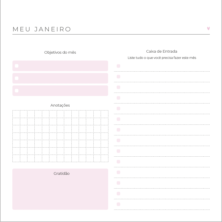 Espaço para anotar: objetivos do mês, anotações, gratidão e caixa de entrada para você Listar tudo o que você precisa fazer este mês.